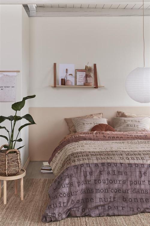 Ariadne at Home dekbedovertrek Checks Naturel is opgebouwd uit banen in verschillende kleuren, die variëren in grootte. De mooie kleurcombinatie geeft het overtrek een warme en gezellige uitstraling. Over de banen heen staat een raster van een ruit geprint samen met Franse teksten. Een leuke twist zijn de verschillende teksten op het kussensloop: ”bonjour” en ”bonne nuit”: om bij weg te dromen!