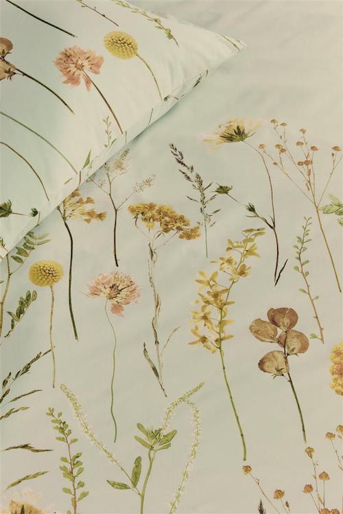 Ariadne at Home Outside Dekbedovertrek haalt het voorjaar in huis. De veldbloemen in natureltinten komen prachtig tot hun recht op de groene ondergrond en laten je opgewekt wakker worden.