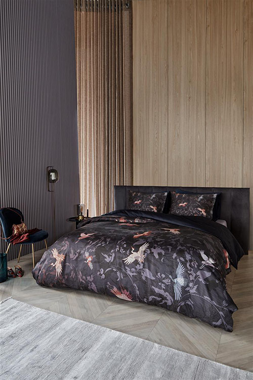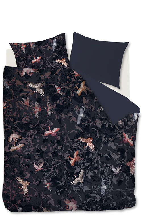 Kardol Dekbedovertrek Endeavour Nachtblauw is een luxe overtrek van hoge kwaliteit dat door de speciale satijnweving extra zacht en soepel aanvoelt. Door de mooie glans van het satijn komt de gelaagdheid met een unieke combinatie tussen gestileerde bloemen en grafische motieven prachtig tot haar recht. De kleuren variëren van diepblauw, charcoal zwart, donkerbruin en aubergine. De diepe kleuren zorgen ervoor dat het lijkt alsof de geschetste kraanvogels, in terra, lila, oker en offwhite, als het ware op het overtrek geborduurd zijn, terwijl het hele dessin geprint is. Het overtrek is onder andere geïnspireerd door de Asian Fashion, met herkenning van Japanse motieven prints die we op kimono kleding terug zien. De achterzijde van Endeavour heeft een effen kleur.