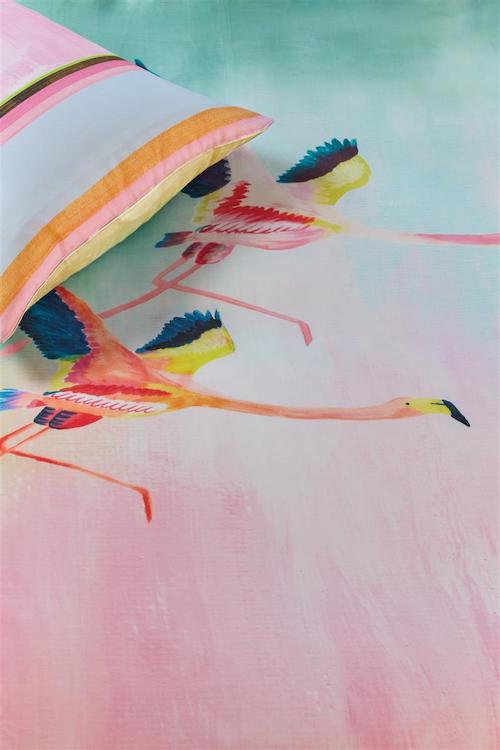 Oilily Colorful Birds Multi dekbedovertrek heeft een prachtig kleurrijk dessin met een zomerse afbeelding van twee vliegende flamingo’s. De flamingo’s zijn afgebeeld op een abstracte aquarel gekleurde achtergrond. Je krijgt hierdoor het gevoel dat je naar een schilderij kijkt. De onderkant van het overtrek bestaat uit grafische banen in effen kleuren. Een leuk detail is de Oilily branding onderaan de instopstrook. De kleuren die terug komen in het dessin zijn blauw, bruin, oranje, geel, groen en roze. De achterkant van het dekbedovertrek en de kussenslopen hebben een effen groene kleur.