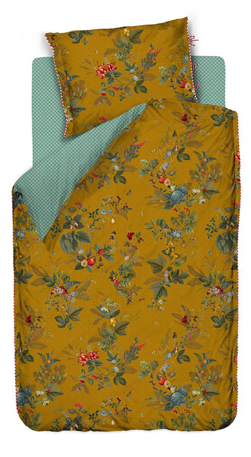 Pip Studio dekbedovertrek Fall in Leaf Geel dekbedovertrek is versierd met warme bloemen, winterse bladeren, vogels en vlinders. De botanische elementen in dit dessin zorgen voor een verrassende combinatie en een echt PIP gevoel. In de ondergrond is een klein geschilderd dessin verwerkt wat een gelaagd effect geeft. De fleurige, rijke kleuren met de okergele achtergrond geven dit overtrek een extra rijke uitstraling. De kussens hebben een oxford-rand, een gestreepte bies en een unieke striksluiting met een verrassend ingeweven gekleurd streepje. De achterkant van zowel de kussens als het overtrek hebben een gestileerd tegelprintje met verfijnde details. Hierdoor kun je beide kanten gebruiken. Dit geeft een leuk mix and match effect op je bed.