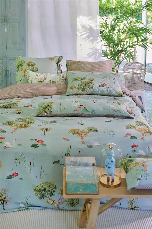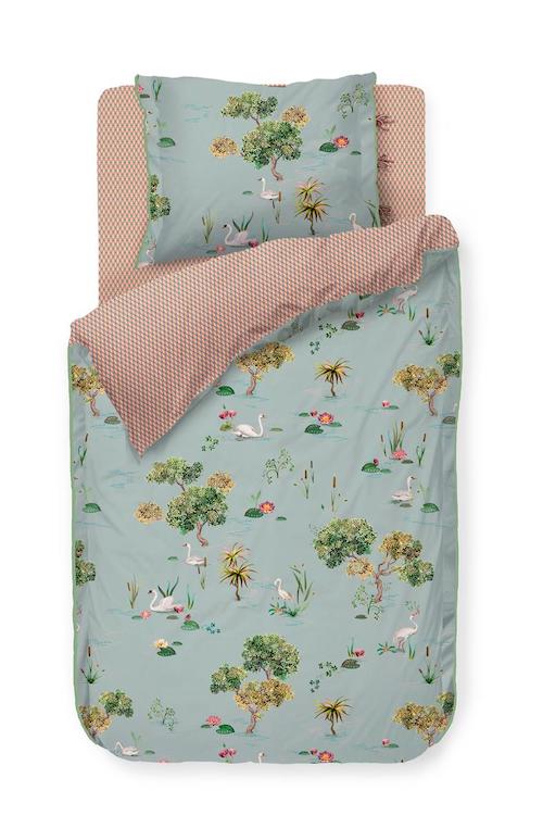 Pip Studio Little Swan Grijs dekbedovertrek is een romatische dekbedovertrek waarmee je je in een Franse siertuin waant. In het dessin is een zwanenmeer te zien, waarin sierlijke witte zwanen tussen de lelies zwemmen. Tussendoor staan er kleine oosterse boompjes en steken er rietsigaren boven het water uit. De achterkant van het overtrek en de slopen heeft een gedetailleerd harlekijn ruitje. De kussenslopen en het dekbedovertrek hebben een oxfordrand en een gekleurde platte bies aan de zijkanten. De kussenslopen hebben een unieke striksluiting. Hierdoor kun je beide kanten gebruiken. Dit geeft een leuk mix and match effect op je bed.