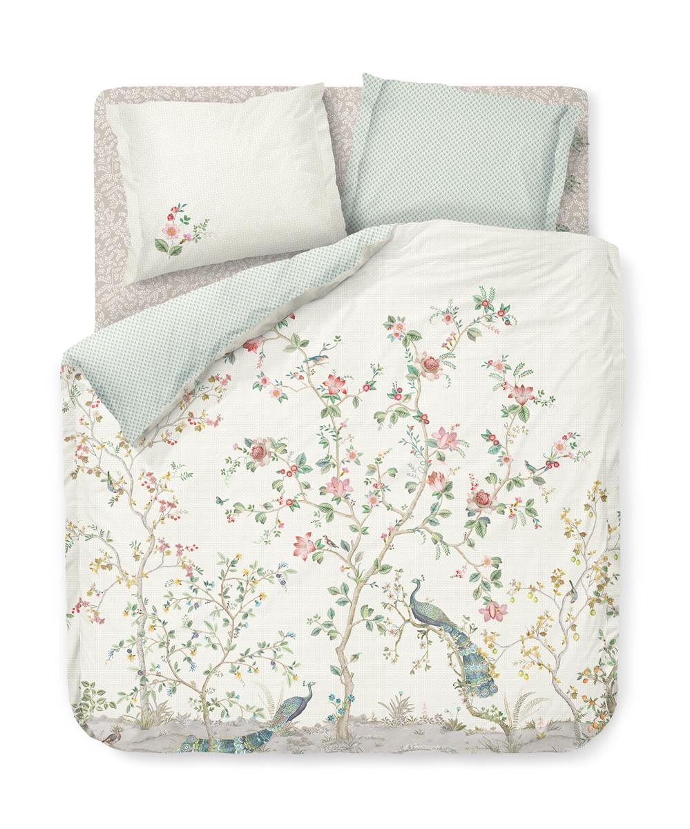 Deze romantische print is geïnspireerd op Oosterse Chinoiserie-prints. Sierlijke pauwen staan parmantig liefdevol in een landschap van Japanse bloesem bomen en oriëntaalse fruitboompjes. Aan de takken groeien prachtige bloemen, exotisch fruit en kleine sierbessen. De achterkant heeft een patroon van gestileerde boogjes. Het overtrek is luxueus met een rijke uitstraling. De kussens en het dekbedovertrek hebben een Oxford rand aan de zijkanten. De kussens hebben twee verschillende kanten. Door de unieke striksluiting kunnen de kussens, net als het dekbedovertrek, dubbelzijdig gebruikt worden. Dit geeft een leuk mix-and-match effect op je bed.Het dekbedovertrek is niet alleen een blikvanger in je slaapkamer, door het gebruik van 100% percal katoen is hij ook nog eens heerlijk zacht. De extra luxe 200TC weefdichtheid zorgt ervoor dat de stof langer mooi blijft. Het dekbedovertrek maak je eenvoudig op dankzij de extra lange instopstrook. Daarna stop je hem gemakkelijk in aan de onderkant van je matras. Je kan het overtrek wassen tot 60 graden, hij is geschikt voor de wasdroger en je kan hem ook strijken. Hoewel de hoogwaardige kwaliteit er voor zorgt, dat strijken eigenlijk niet nodig is.